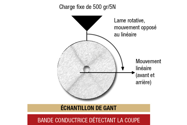 La norme de coupe EN 388 utilise une lame circulaire sous une charge fixe dans sa méthode de test pour déterminer les rotations de la lame nécessaires pour couper le matériau du gant. Un niveau de coupe est ensuite assigné au matériau du gant, établi selon le nombre de rotations de la lame utilisées durant le test. De plus, un test de résistance à la coupure est également effectué à l'aide d'une machine de test de coupure TDM 100. Ce test, mesuré en Newtons, détermine la résistance à la coupure avec une lame droite. Ceci ajoutera 6 niveaux supplémentaires à la norme de résistance à la coupure, représentés par les lettres A à F.
