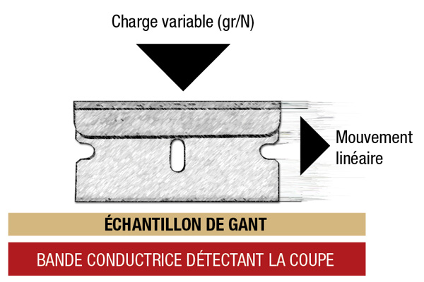 La méthode de test pour la norme de coupe d’ANSI fait appel à une lame de rasoir afin de déterminer le poids en gramme requis pour couper le matériau du gant d’un mouvement linéaire. Un niveau de coupe est ensuite assigné au matériau du gant, établi selon une vaste gamme de poids utilisés durant le test.